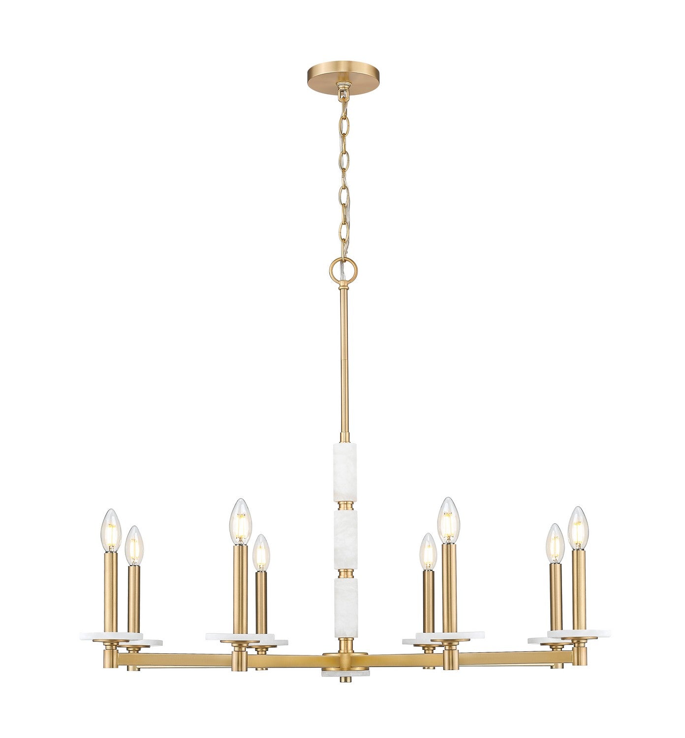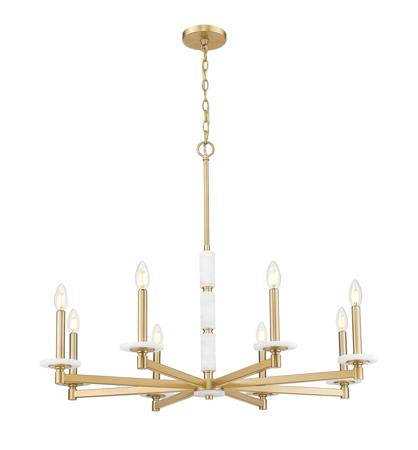 Looking for an effortless fusion of warmth, balance, and beauty? The modern gold frame of this stunning eight-light chandelier curves gracefully around eight alabaster spheres, each one glowing with a natural, calming light. It brings softness to high ceilings and a golden tone to every gathering.