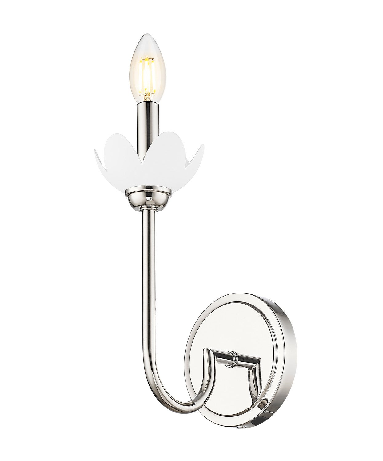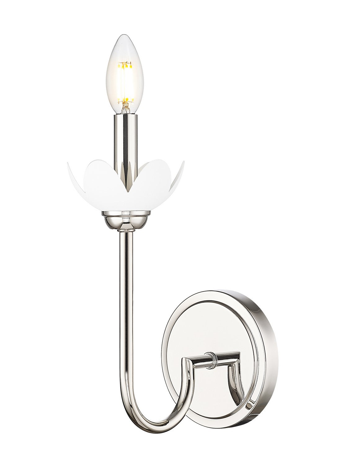 Gleaming polished nickel finishing sets a refined, modern tone for a vintage inspired transitional wall sconce. Designed with interchangeable bobeches in white metal and clear glass, the design offers charming organic flair with its botanical silhouette. A curvy arm and round wall plate round out the design, which offer impeccable charm in your living room, library or bedroom.