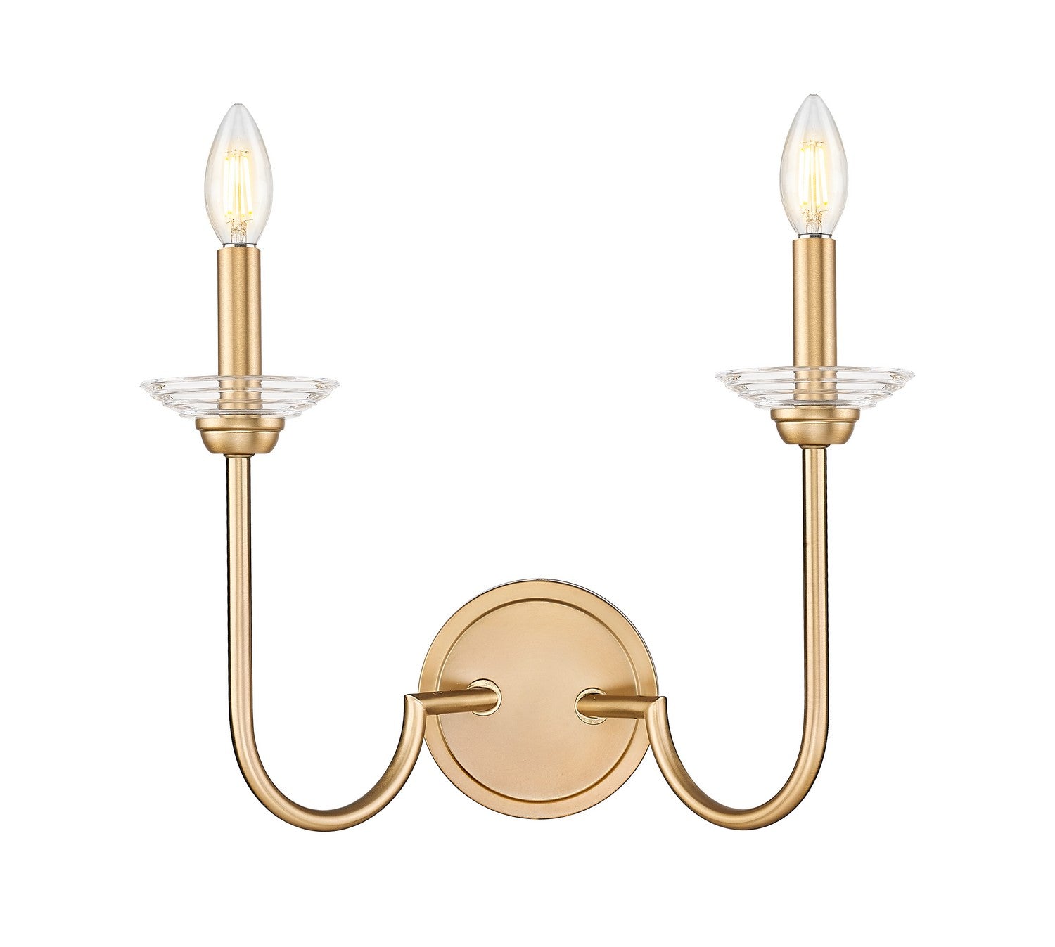 The warmth of a modern gold finish encourages the vintage charm of this transitional two-light wall sconce. Beautiful in a bath or elsewhere in the home, it features interchangeable flower petal bobeches in white metal and clear glass, creating a botanical accent that softens surrounding decor. Bold J-shaped arms are tall and eye-catching, perfect for a decorative focal point.