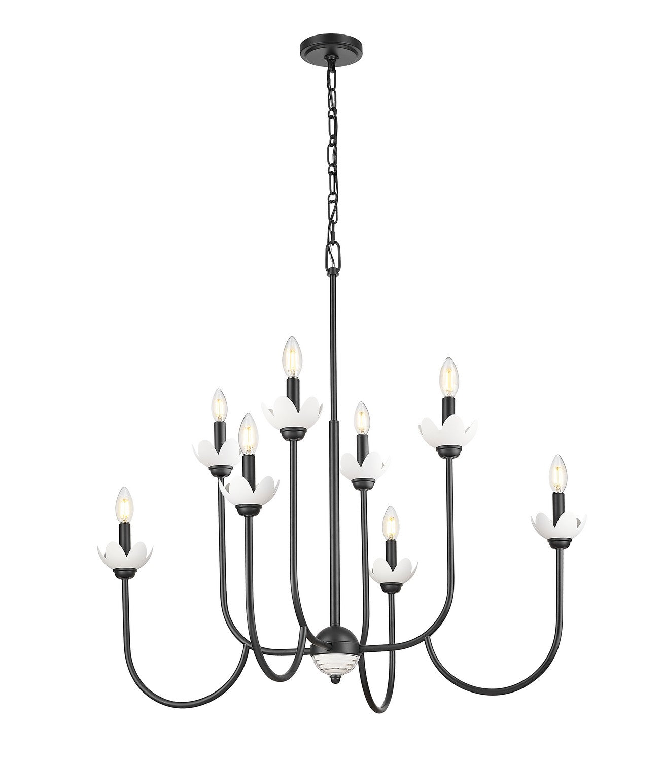 Delicate floral bobeches, in interchangeable white metal and clear glass, highlight this transitional eight-light chandelier. Perfect over a foyer or in your dining room, it offers a clean, fresh ambiance with a center sphere of clear glass and a matte black finish that adds contrast and depth. Curvy arms create a two-tiered silhouette and ensure an inviting ambiance in any setting.
