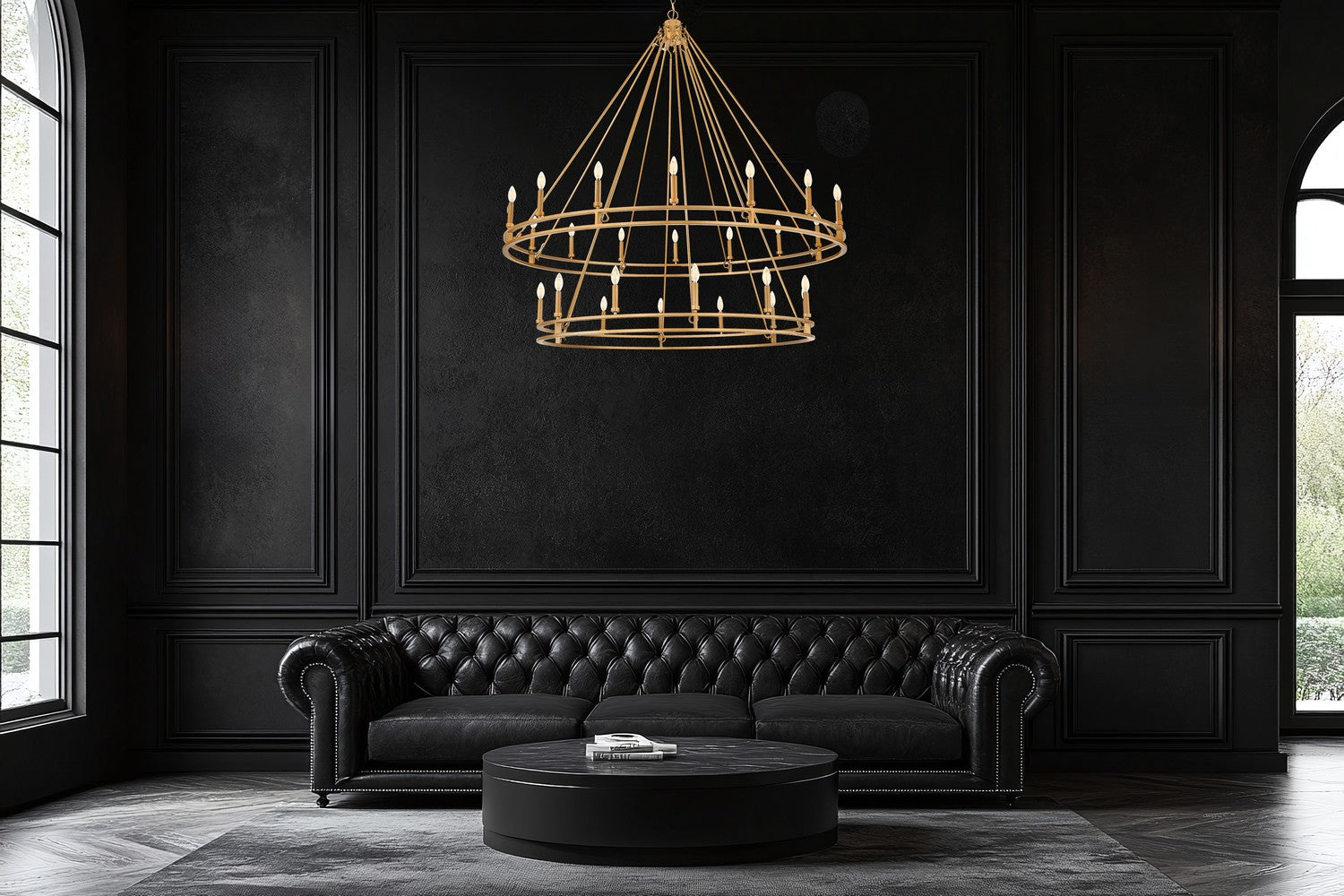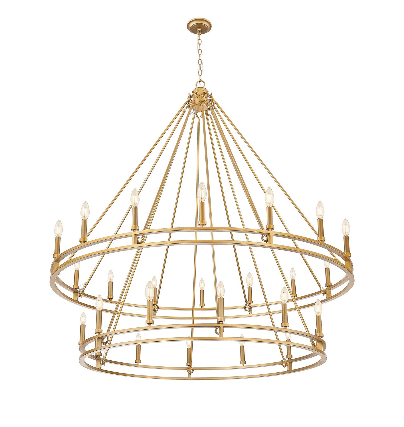 Elevate every inch of your ceiling space. This expansive twenty-eight-light chandelier offers unmatched presence with its signature brass finish and open, minimalist design. It brings a luxurious sense of scale to great rooms, event spaces, or oversized foyers.