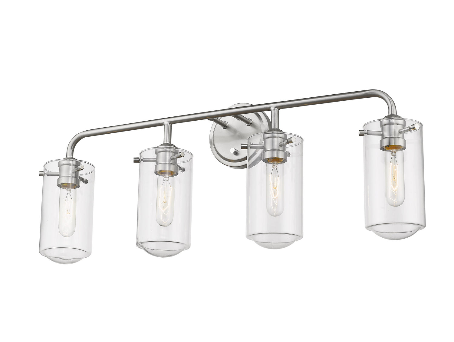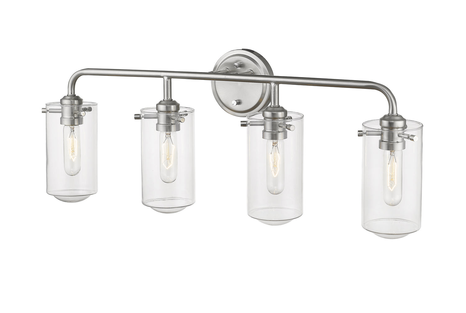 All eyes avert upward to take in the beautiful design of this four-light bath light. Gorgeous brushed nickel steel and clear glass shades form a delicate look with an edgy industrial aesthetic.