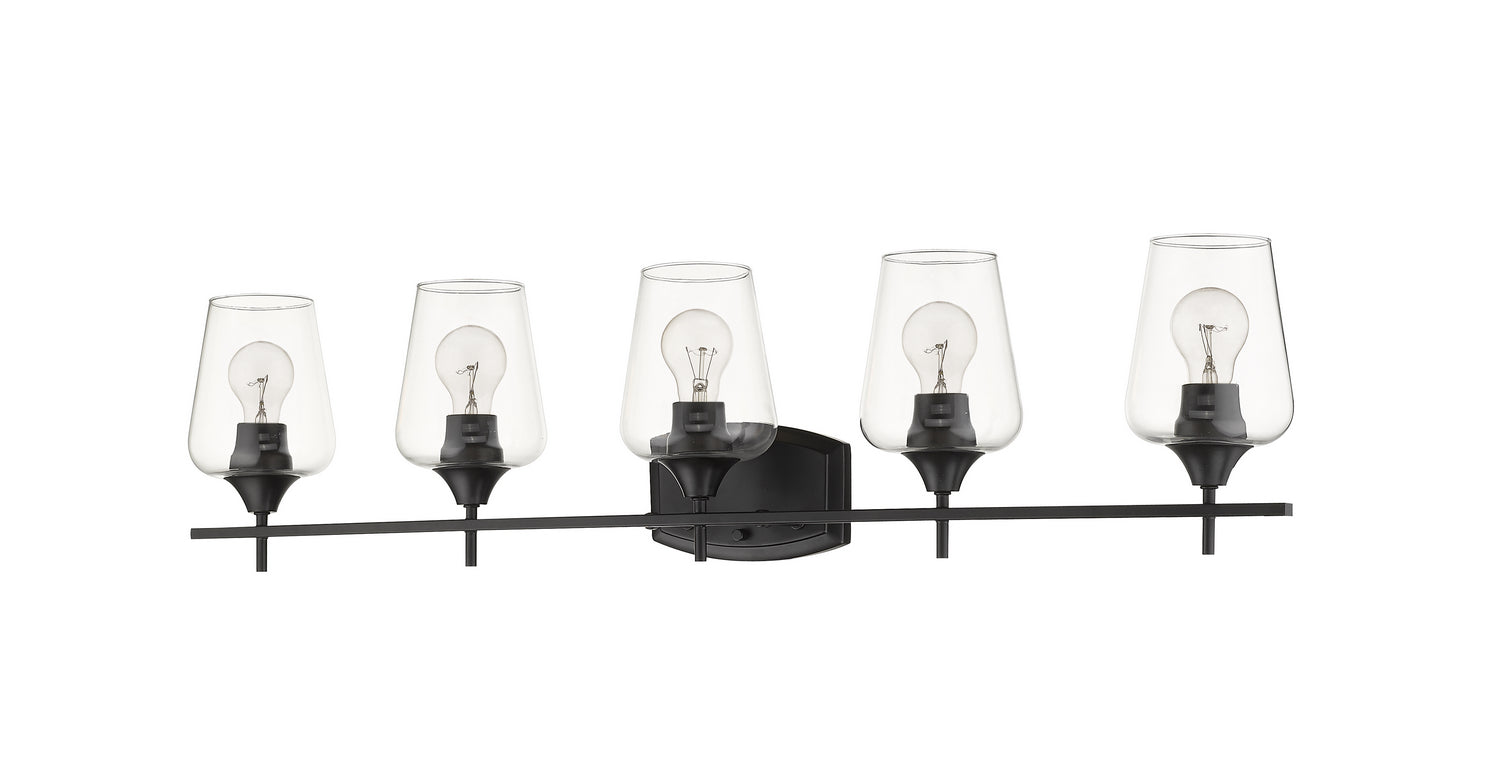 Upscale sophistication with a Mid Century Modern vibe tells the story of this elegant five-light vanity light. A blend of delightful materials offers stunning large glass shades with bold Matte Black finish metal, offering an enticing frame to illuminate a custom master or guest bath sink.
