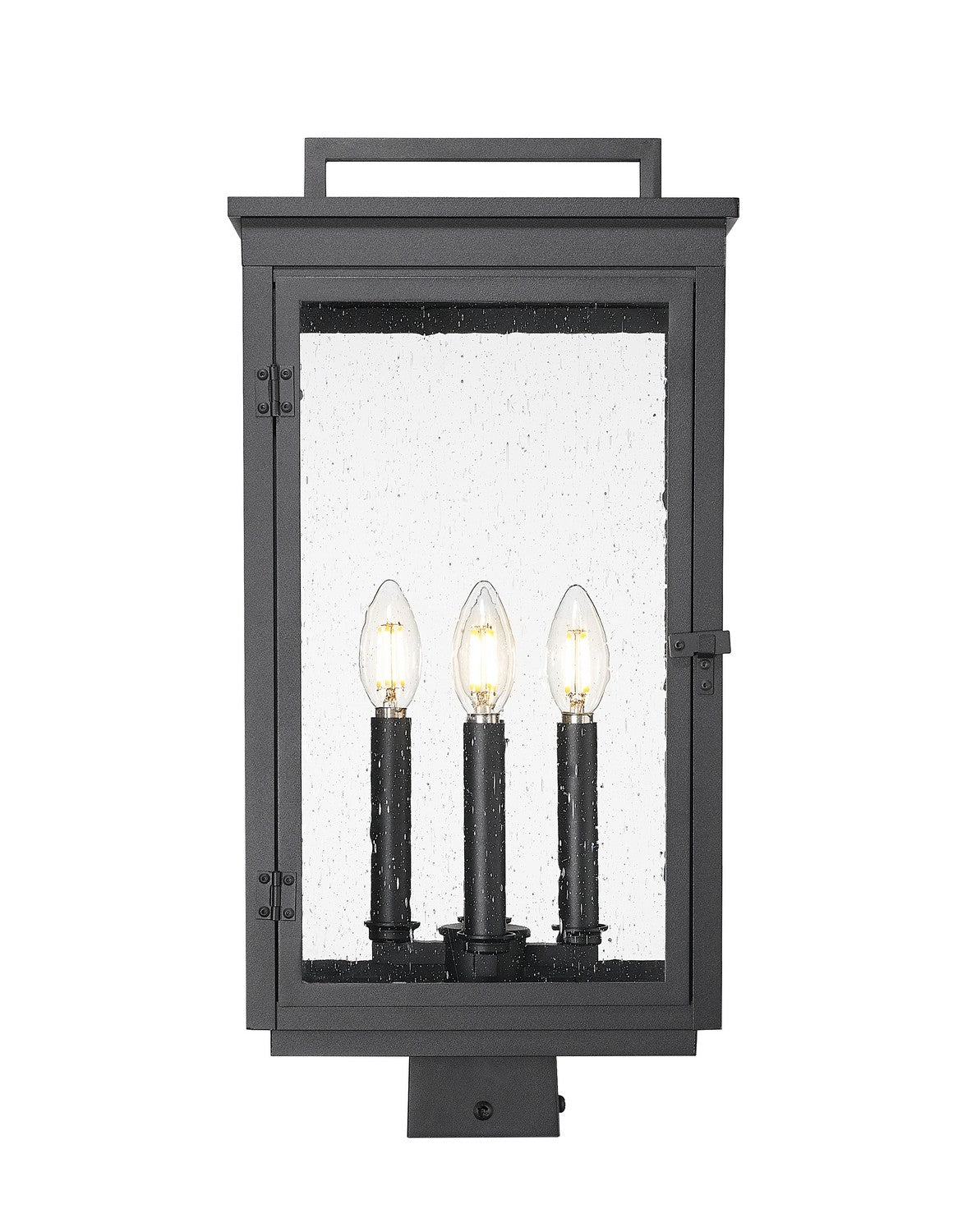 Wrapped in a sand black finish and brimming with character, this four light outdoor post mount fixture turns classic design into a bold statement. Four candle-like lights glow through clear seedy glass, evoking warmth with every flicker. It brings instant presence to pathways, gates, and garden moments.