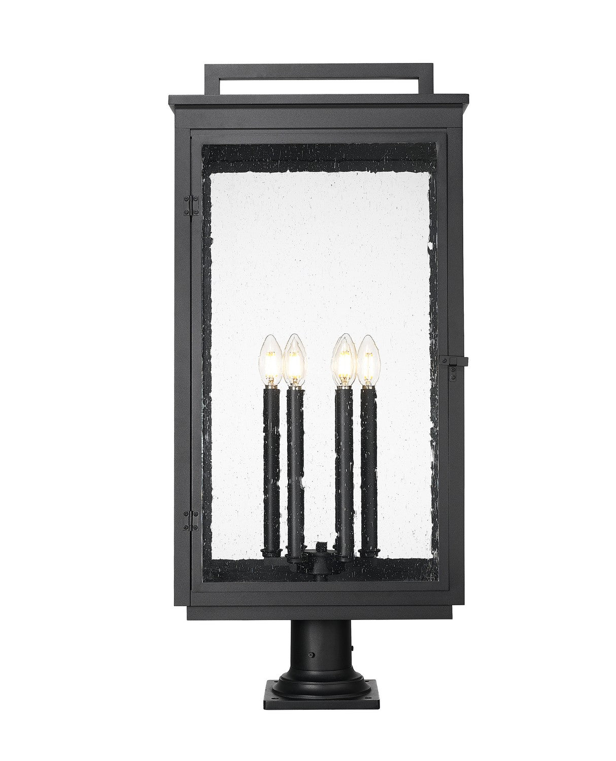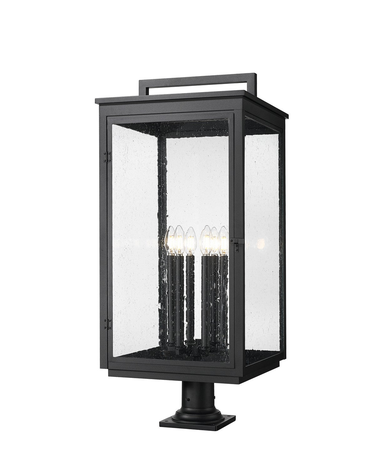 Infused with craftsman character, this traditional Mission six-light outdoor pier mount fixture radiates inviting ambiance. Perfect for a front walk or inviting patio, it features a candelabra cluster of lights tucked within clear seedy glass panes that add texture and dimensionality. A sand black finish completes the look with marine-grade durability that stands up to the elements.