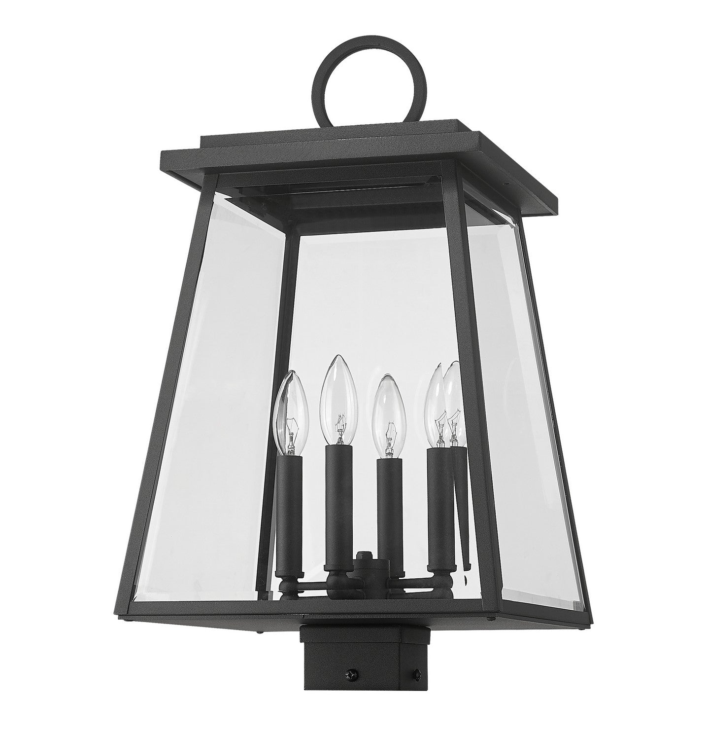 Treat an updated exterior space with a throwback to old time village nautical attitude. From the Broughton collection, this four-light outdoor post-mount fixture offers construction of sleek black aluminum and clear beveled glass panels on its lantern-style shade. Romantic candelabra bulb mounts seal the deal on a tasteful look.