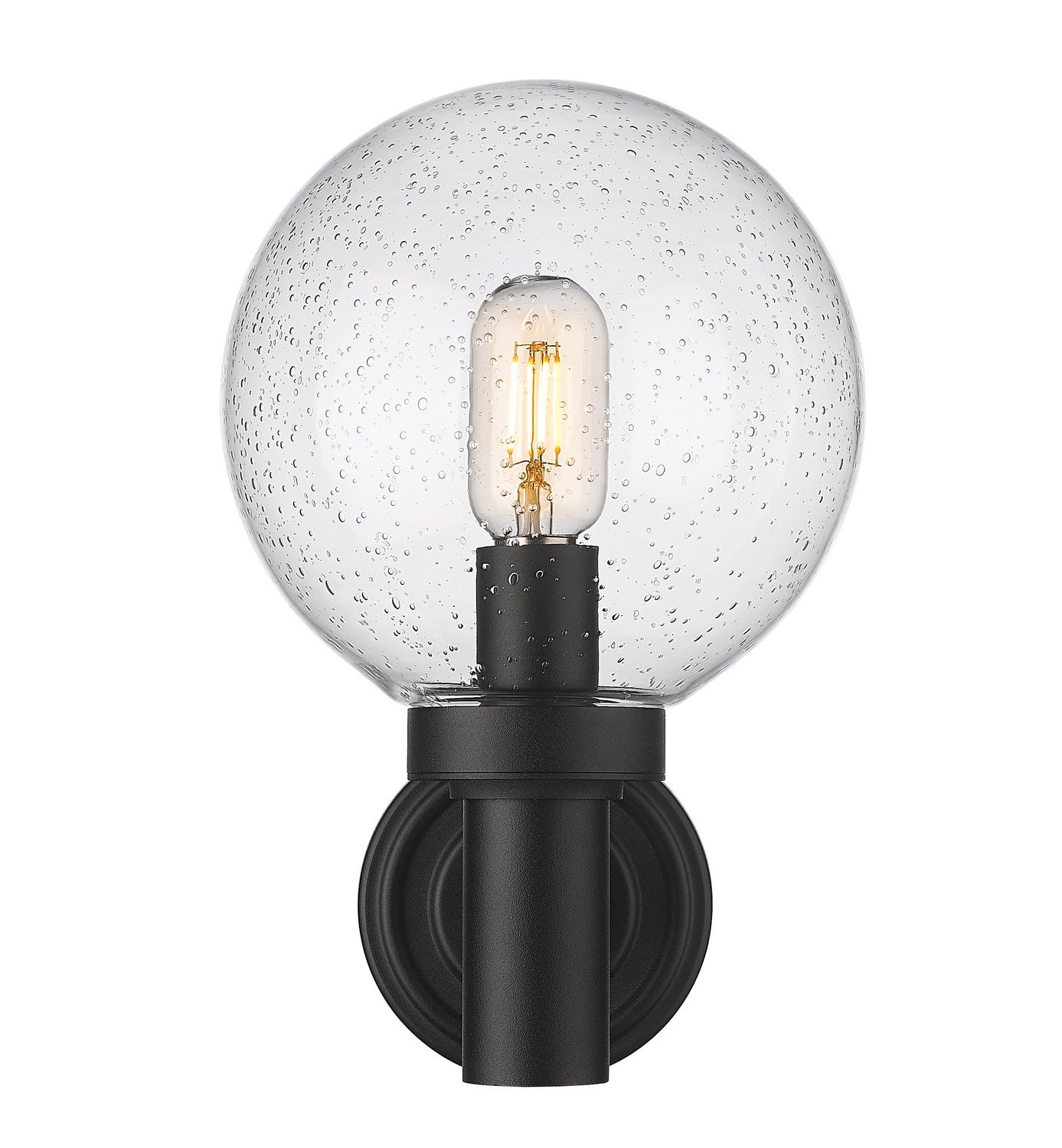 A blend of Mid-Century Modern personality and updated linear silhouetting plays into the tasteful look of a classic exterior light fixture. From the Laurent collection comes a one-light outdoor wall sconce with an updated nautical village feel. A simple yet tasteful black finish aluminum frame and wall plate hosts a chic globe shade fashioned of delicate clear seedy glass.