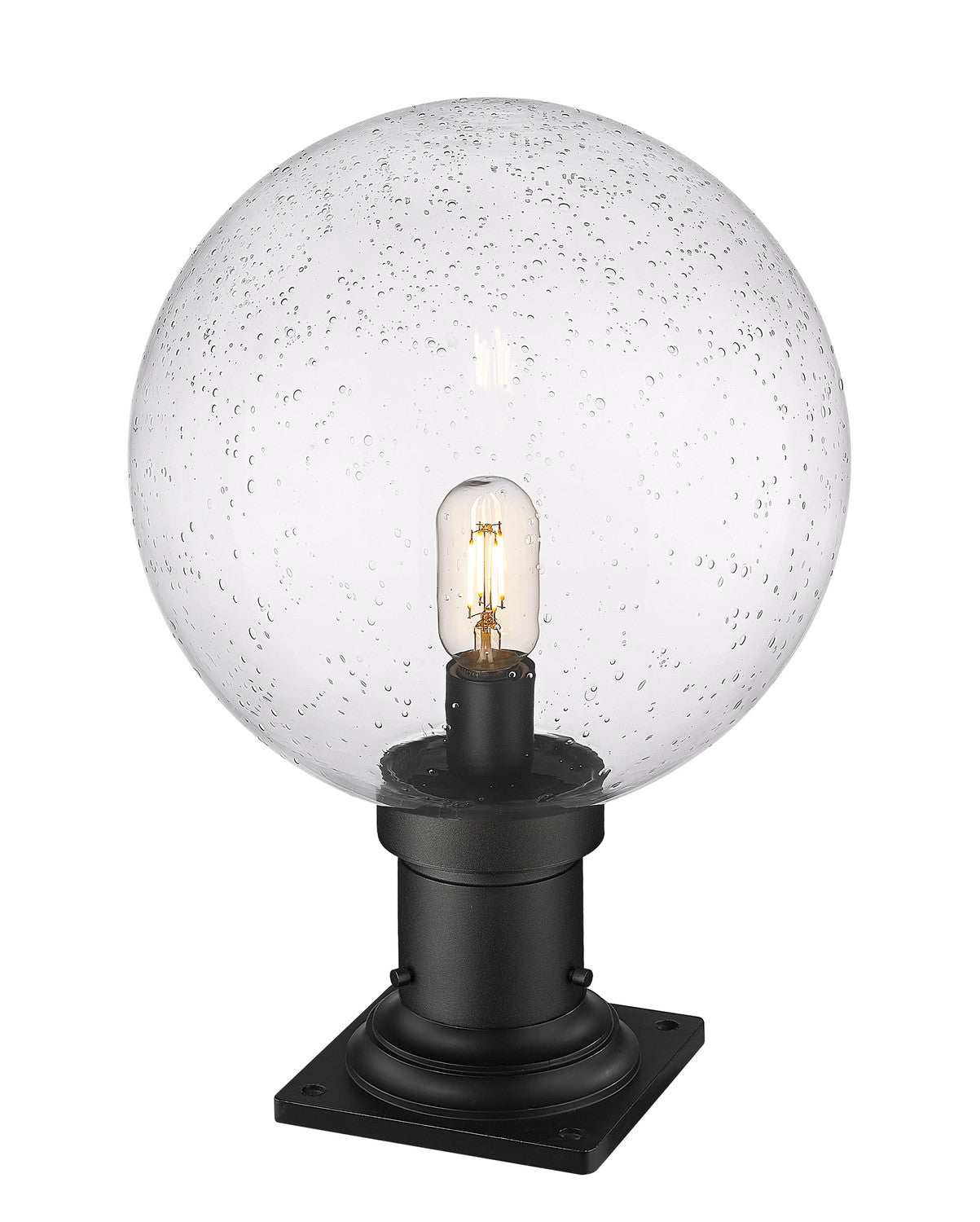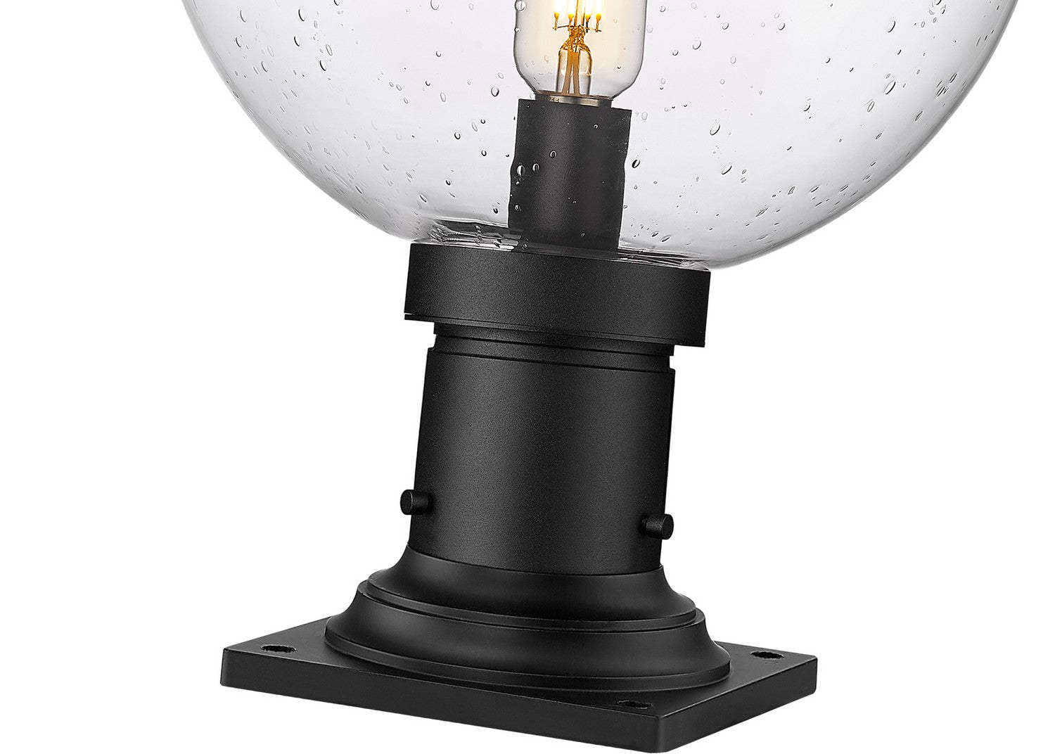 Embellish the design aesthetic in a yard space or deck with a classic light source. From the Laurent collection comes a one-light outdoor pier mounted fixture delivering no shortage of personality and a quaint look ideal for gardens and walkways. This light fixture features construction of versatile black finish aluminum and is topped with a delicate clear seedy glass globe.