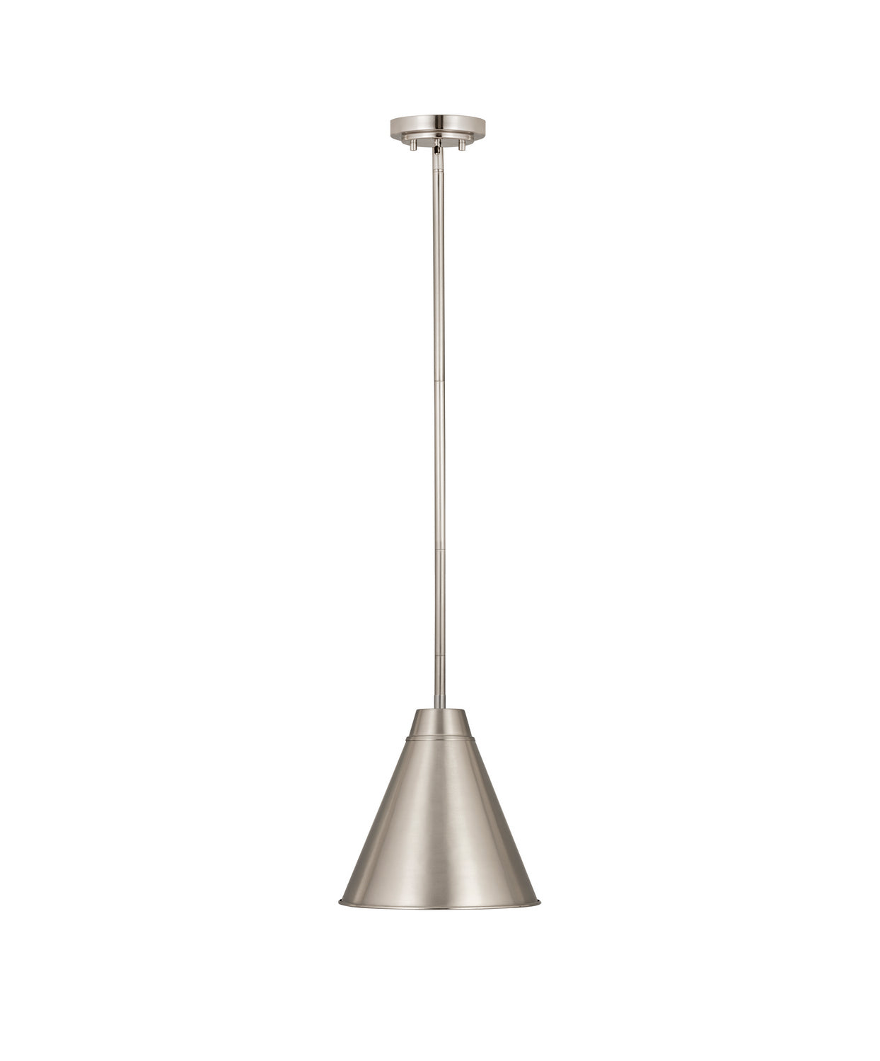 A customized kitchen or living space deserves fashionable lighting fixtures, and this one-light pendant from the Eaton collection delivers. This sleek, simple light offers a minimalist design with a cone-shaped shade, down rod, and canopy mount crafted of iron with a lovely brushed nickel finish. Mount this light straight-up or on a sloped ceiling.