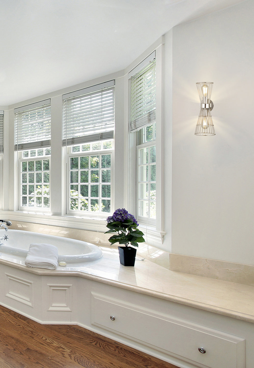 A cage-like design offers a hint of industrial inspiration to this energizing two-light wall sconce, a superb choice for a custom casual space. Light up a hallway, bathroom, or bedroom with this sconce from the Alito collection offering geometric elegance in a concave silhouette and thin wires made of gleaming polished nickel finish iron. Adding separately purchased vintage style bulbs changes up its motif to reflect versatility.