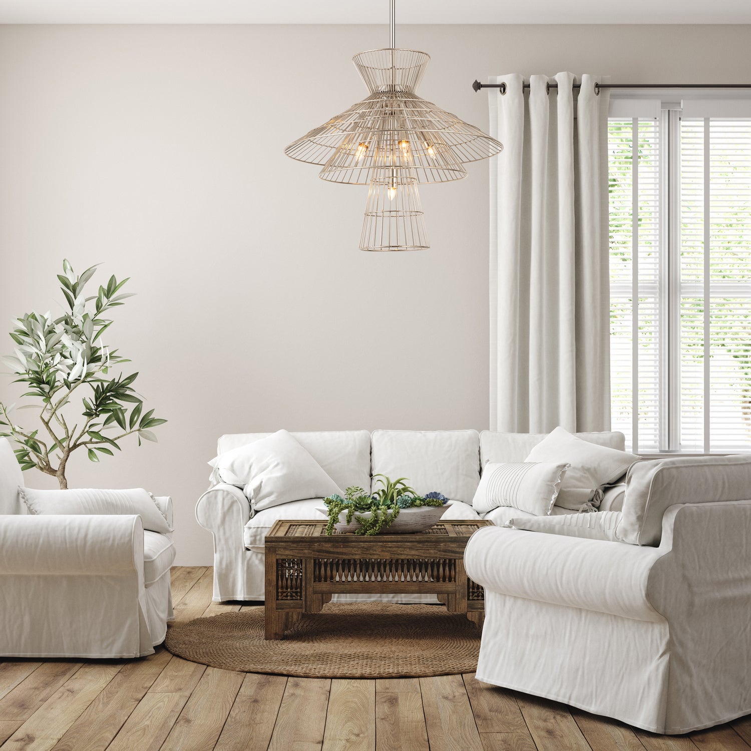 Offer up an energetic look while choosing lighting in a custom space, adding the Alito six-light pendant to steal the show. Gleaming polished nickel finish iron crafts a tiered geometric arrangement of wired pieces and matching down rod and canopy. This striking fixture reflects a blend of industrial and modern styling.