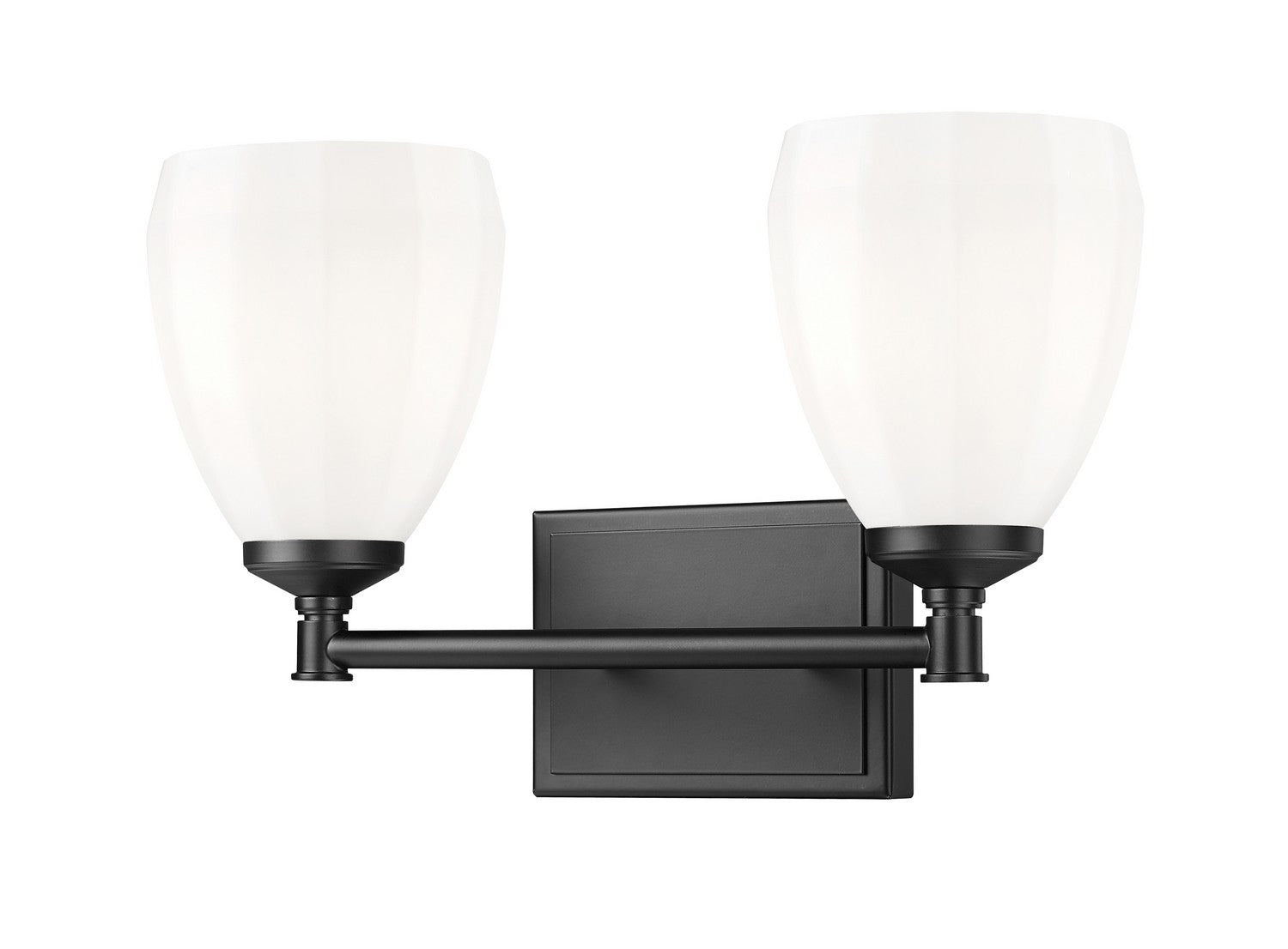 Elongated matte opal glass shades capture attention with their unique shape, brining stylish flair to this modern two-light vanity wall sconce. Perfect for both ambiance and tasks, it casts a rich glow and adds contrast with its matte black finish and simple steel framework. It's the perfect choice for a powder room or full bath.