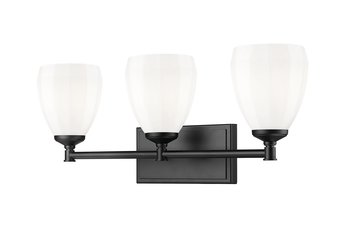 Capture the richness of clean, simple lines paired with elegant finishes on this modern three-light vanity wall light. In matte black, it adds bold contrast against most walls, ensuring eye-catching character. Three lights are surrounded with matte opal glass, casting bright, diffused illumination perfect for grooming and beauty tasks or ambiance.