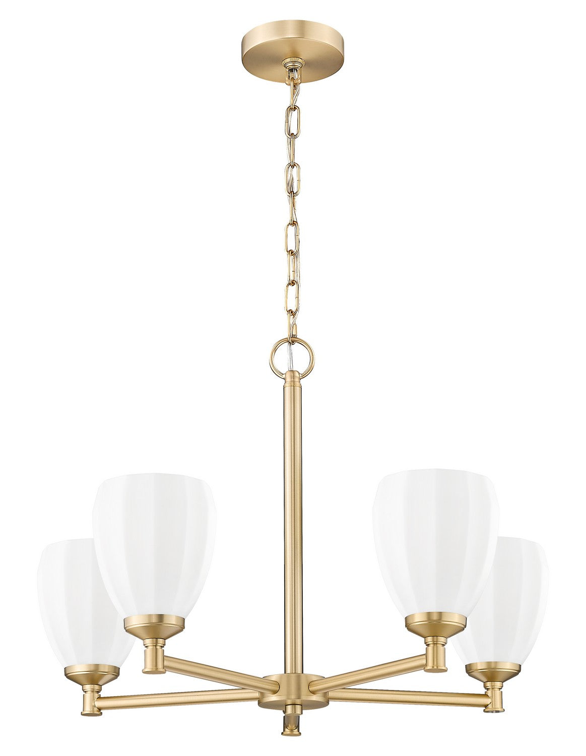 Set a sophisticated ambiance with this modern five-light chandelier as it casts inviting illumination over your entry or dining room. It's a clean-lined profile crafted in steel, complete with a modern gold finish that lends richness and warmth to your home. Each light is enhanced with a lovely opal glass shade with a tapering tulip inspired silhouette with delicate faceting that adds unique flair.