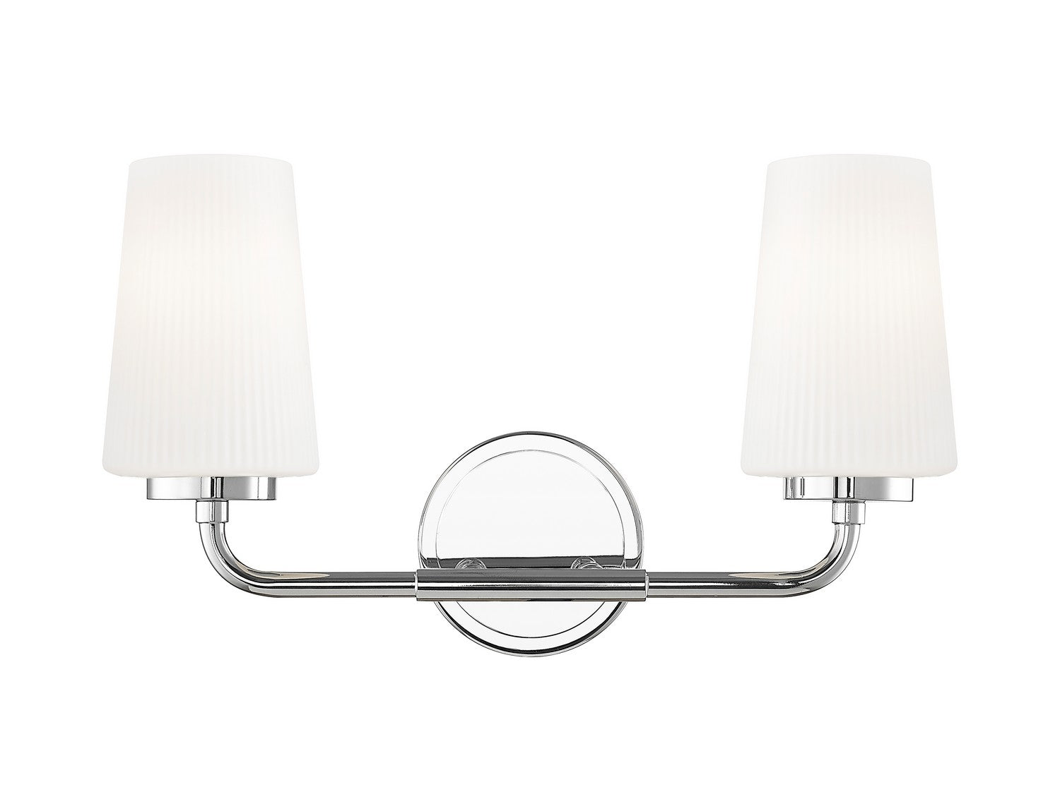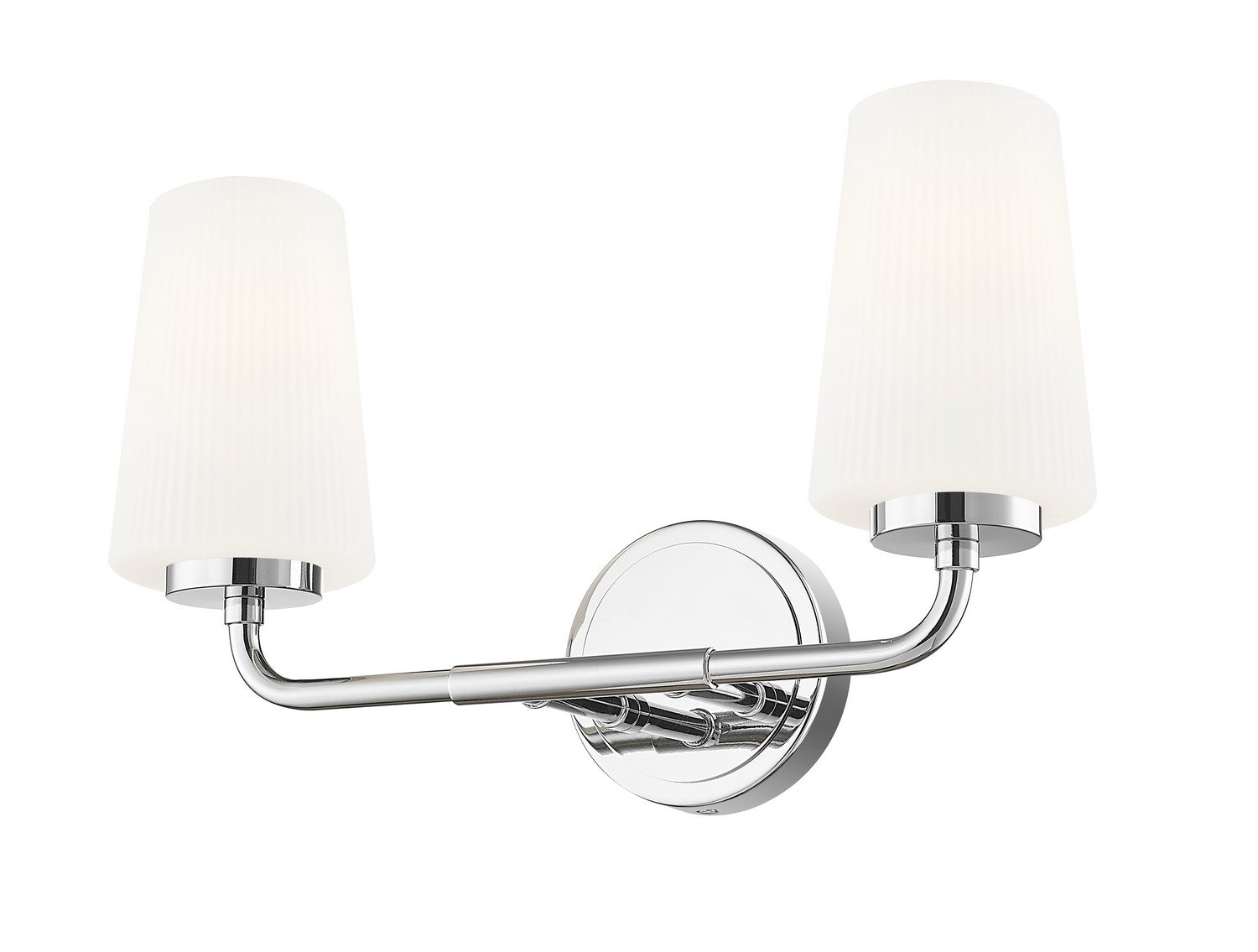 Ribbed opal glass creates the perfect hint of texture and depth for a modern two-light vanity sconce that's perfect for primary and guest baths. In gleaming chrome, it shines with stylish appeal, delivering simplicity with a round wall plate and extended U-shaped arm. Add one over a mirror or a pair on either side to create the right lighting for your space.