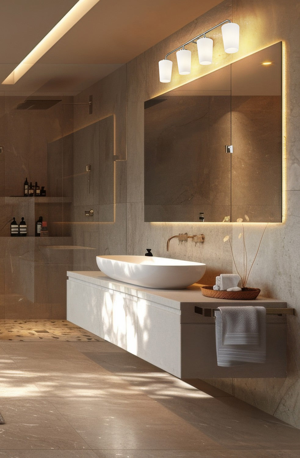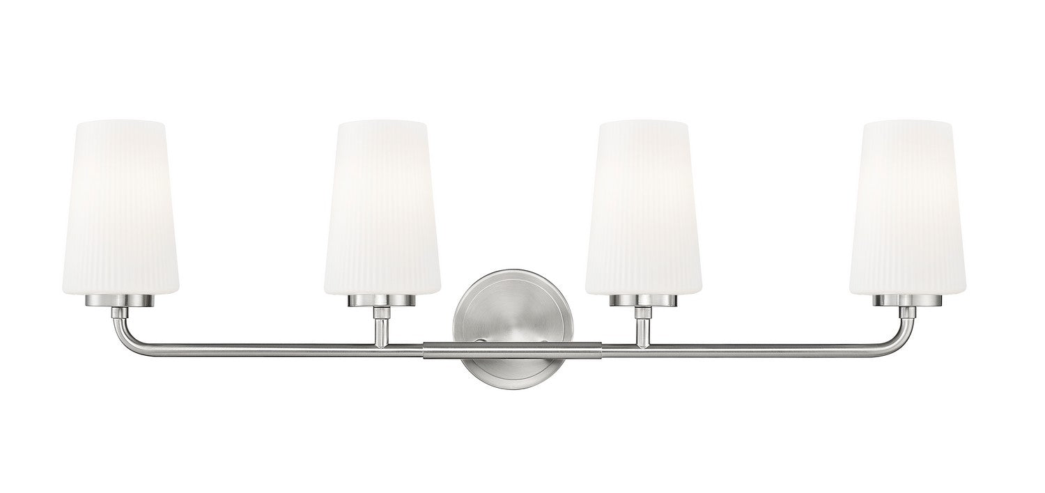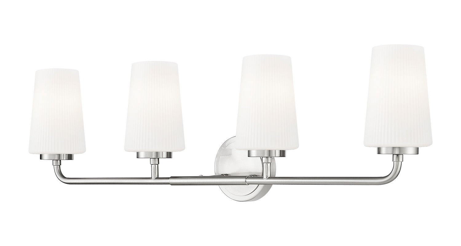 Set a refined tone in your primary or guest en suite with this modern four-light vanity wall light. Tall, tapering shades crafted in ribbed opal glass glow with light, offering excellent ambiance for all your morning and evening rituals. Its brushed nickel finish gleams in the light and adds subtle, timeless style.