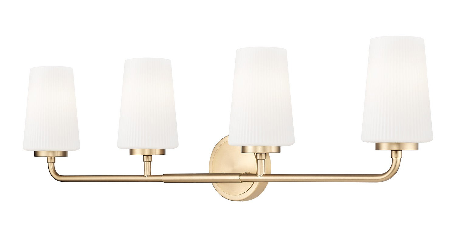 Satisfying simplicity blends with a vintage inspired modern gold finish to bring delicate contrast to this modern four-light vanity wall light. Its ribbed opal glass shades stand tall and slim, offering diffused illumination and excellent ambiance. A clean-lined profile includes a round wall plate and delicately curved arm, offering industrial inspirations in your primary or guest bath.