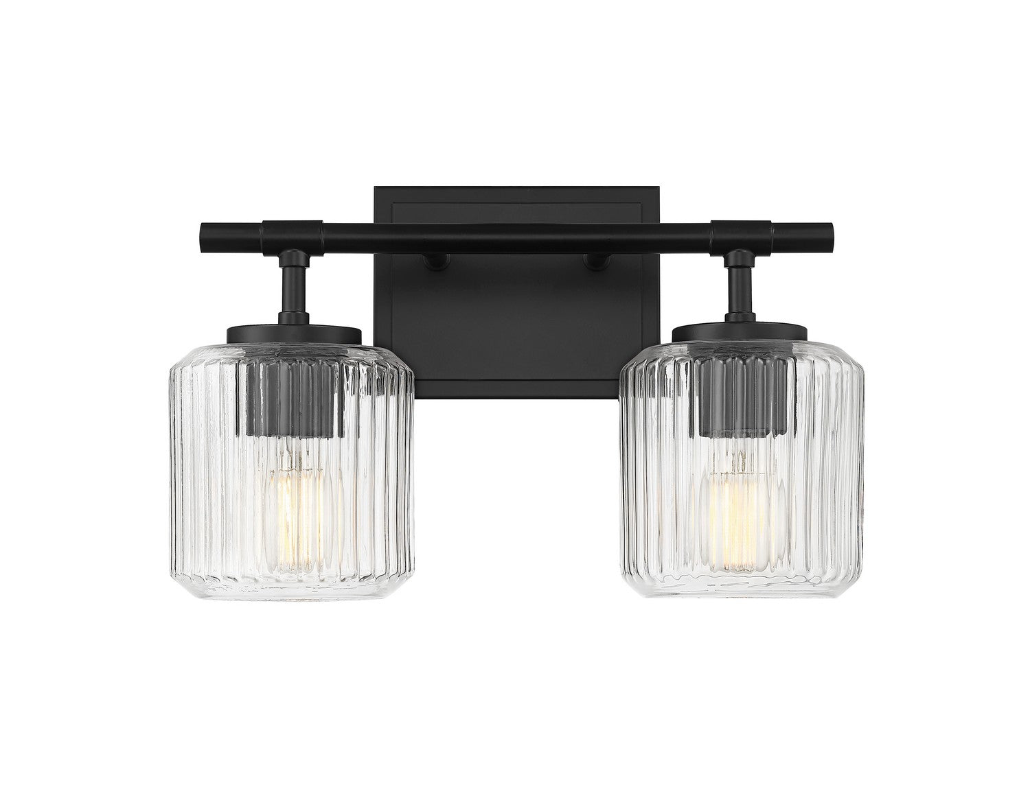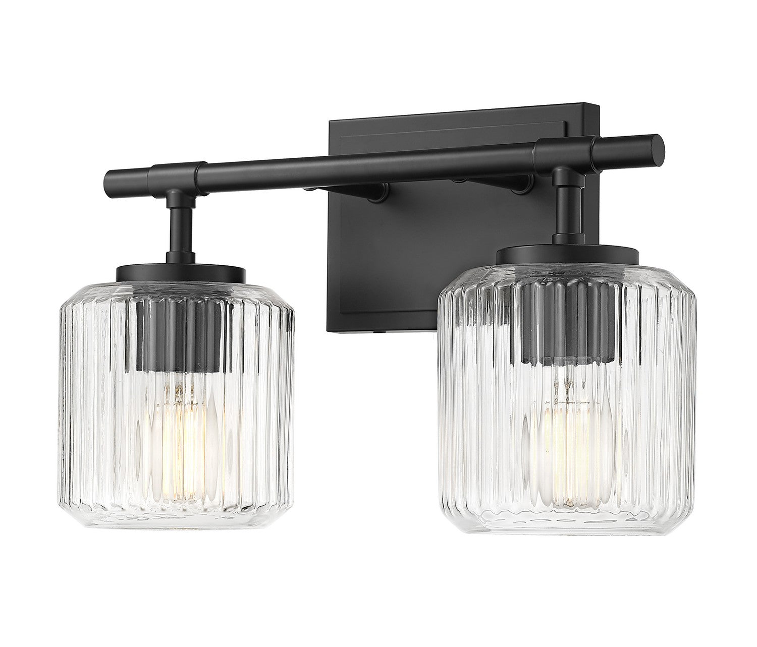 Augment contemporary or traditional design aesthetics with this modern two-light vanity bath light. A rich matte black finish rectangular wall plate and straight arms create contrast and depth, perfect for a variety of bath settings. Ribbed clear glass shades sparkle and seem to undulate when illuminated, adding depth and sophistication.