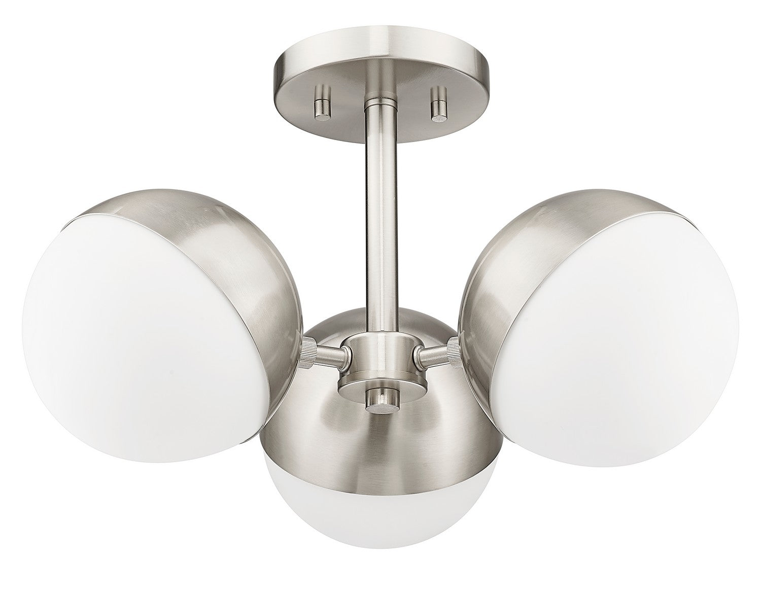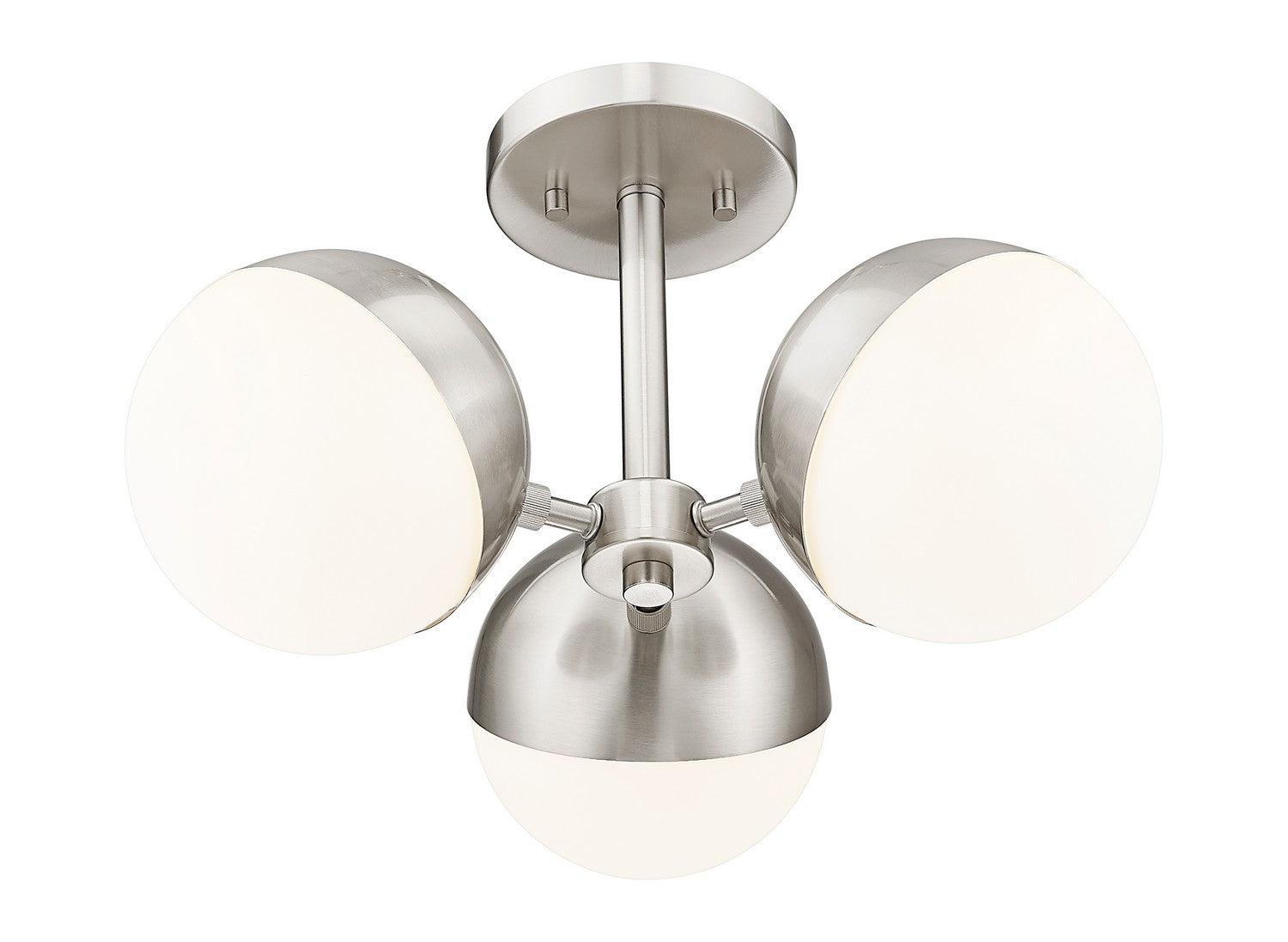 Put a stylish spin on bedroom or den lighting with this modern three-light semi-flushmount ceiling light. Its clustered configuration features a trio of opal glass orbs, each with a moveable shield that creates directional illumination to best suit your space. Its chic brushed nickel finish sets a soothing, refined tone, perfect for understated spaces.