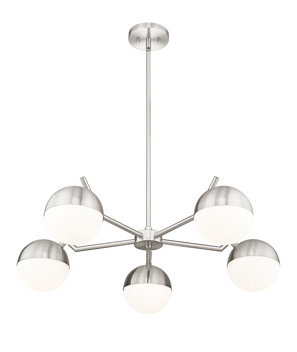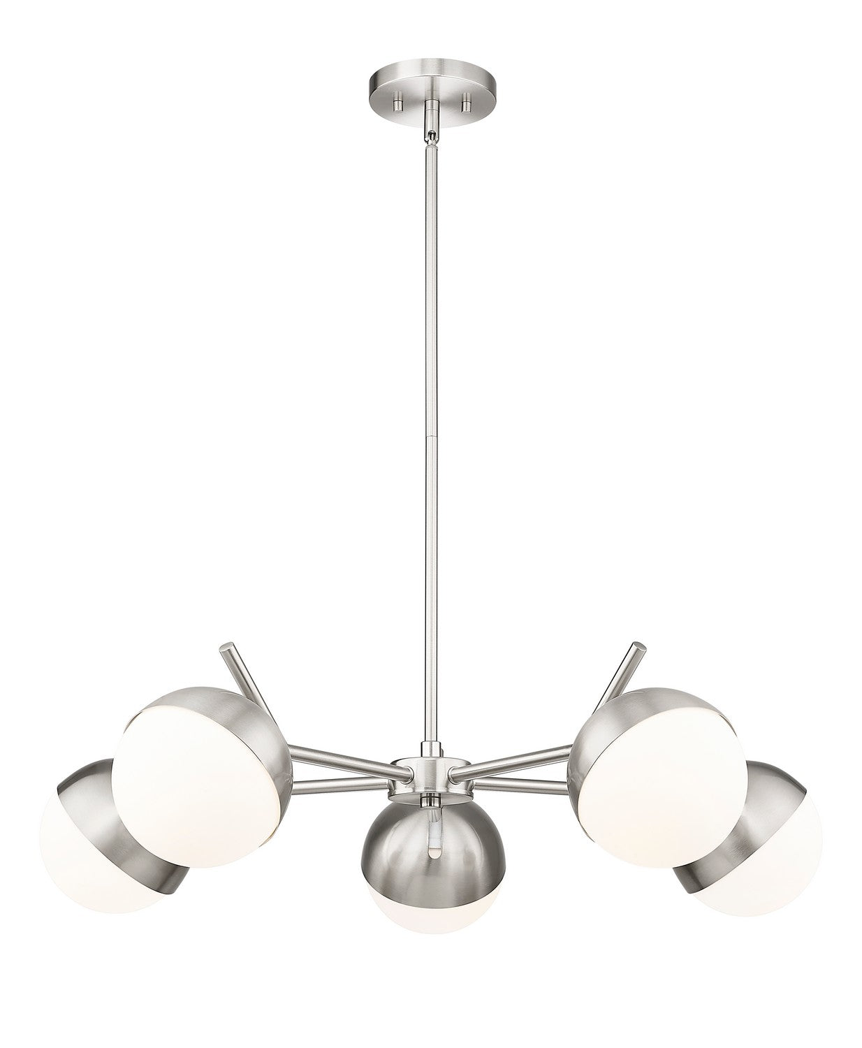 A radiant configuration of angular arms in a sleek brushed nickel finish create a compelling style for this modern five-light chandelier. Striking over a dining table or other gathering space, it features a clean, straight-lined silhouette and is complete with opal glass orb shades for inviting illumination.