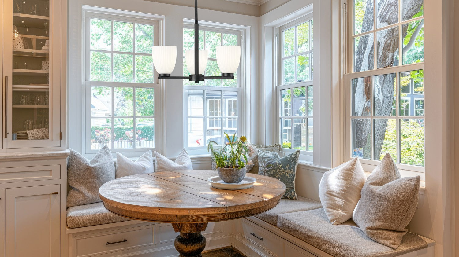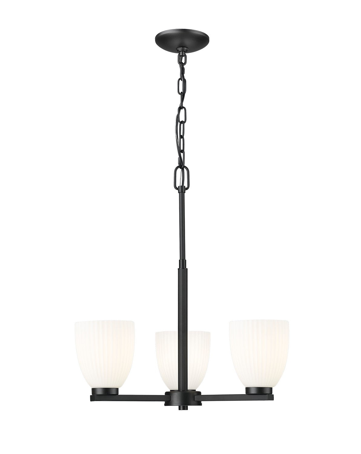 Framed in a matte black finish and glowing with matte opal glass, this three-light chandelier brings sculptural presence to any space. Ribbed opal shades diffuse the light with quiet elegance, creating a soft and balanced ambiance. It's a refined focal point that anchors the room with effortless style.