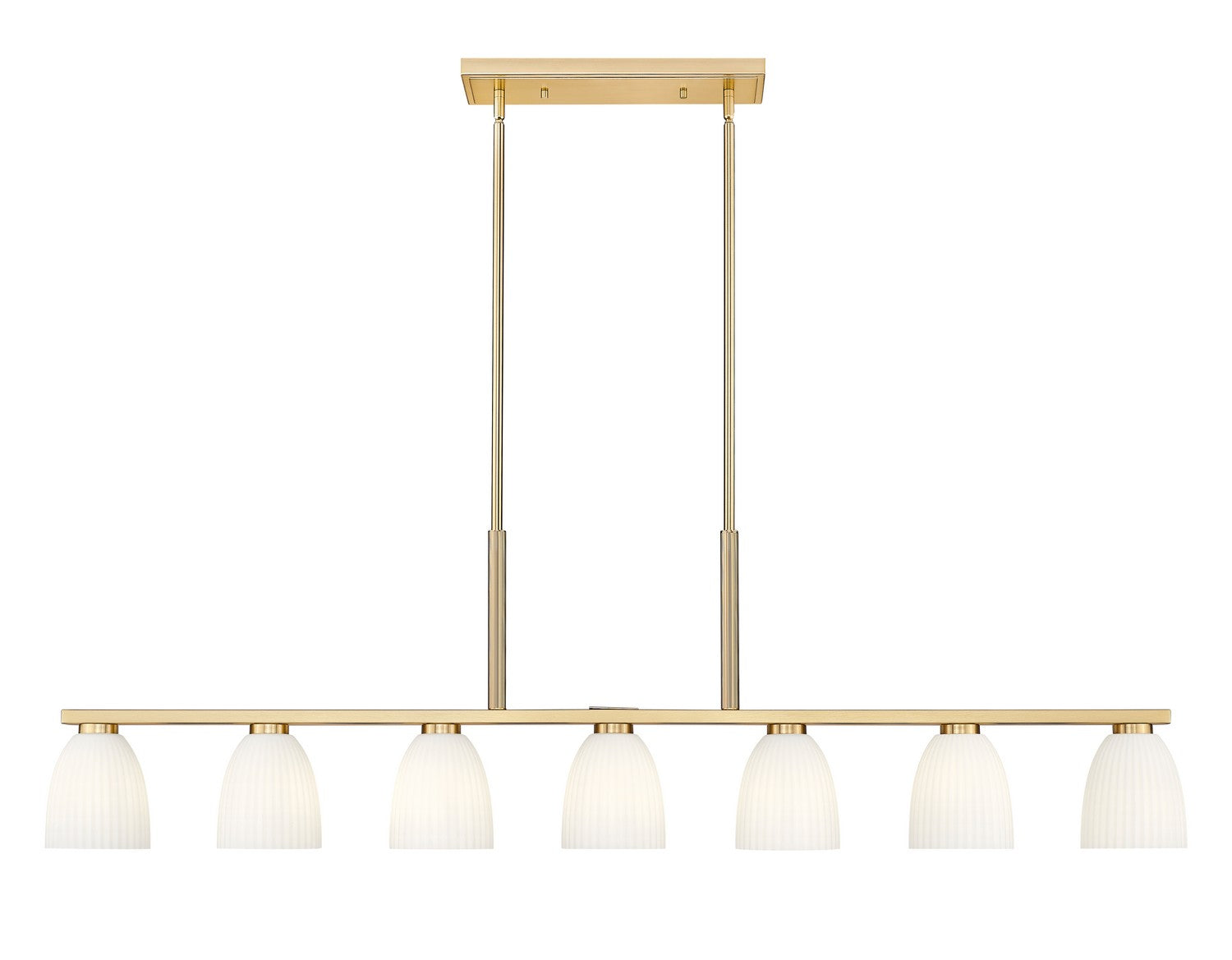 Stunning in silhouette and rich in tone, this seven-light linear chandelier in a modern gold finish brings soft elegance to your space. Ribbed matte opal glass shades lend subtle movement and luminous warmth across wide surfaces. It's graceful, balanced lighting that lives beautifully above the heart of the home.
