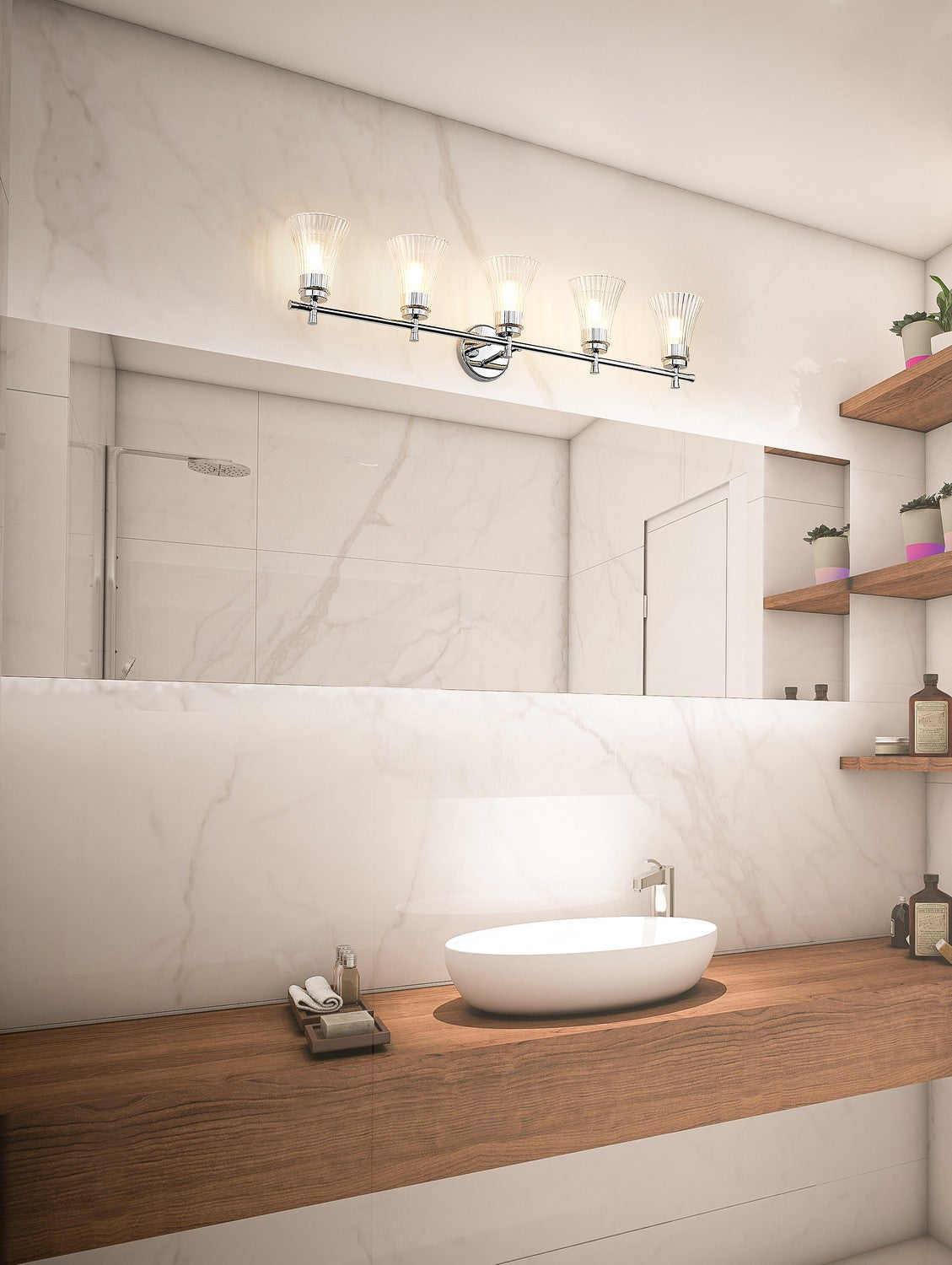 With its chrome finish and fluted clear glass shades, this five-light vanity fixture brings sparkle and clarity in every direction. The delicate detailing adds a hint of glamour without feeling too formal. We love a fixture that makes even simple spaces feel oh-so-special.
