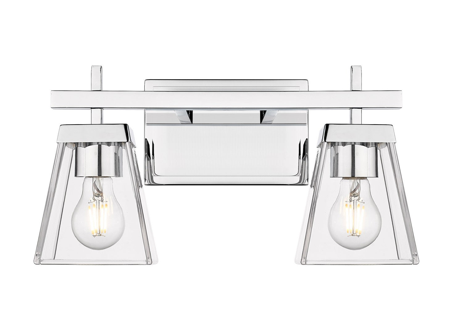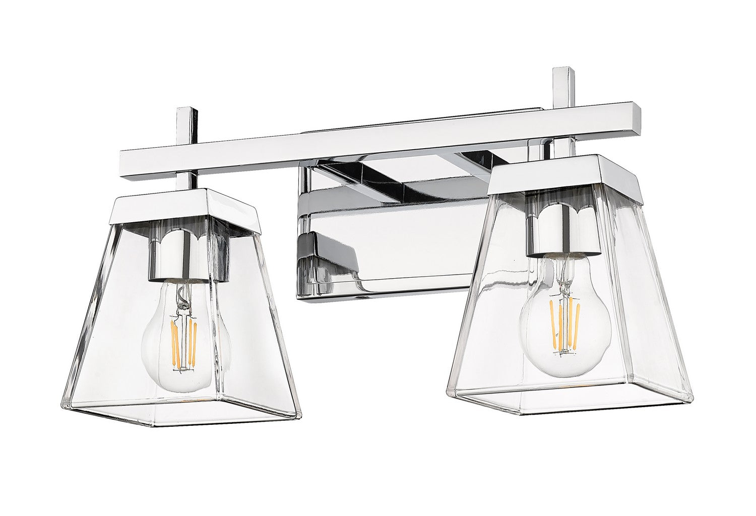 Long, lean lines encourage the clean, simple precision of this modern two-light vanity sconce. Perfect for delivering bright, direct illumination, the sconce features a pair of flared shades, each crafted in clear glass and perched within a chrome finish frame. Mount this sconce with lights up or down to create a spa-like bathroom ambiance.