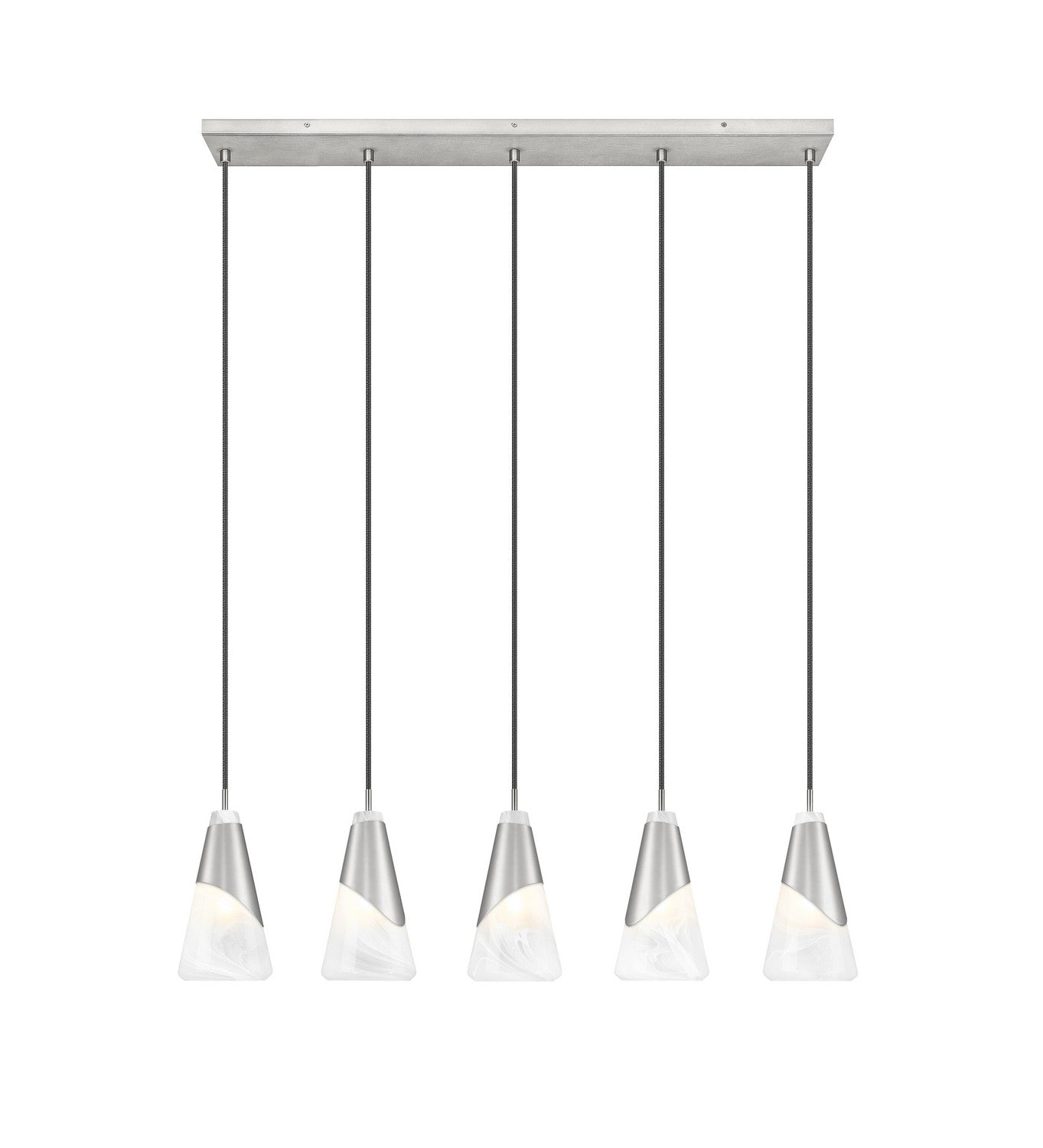 Introduce chic opulence over a kitchen island or dining table with this modern five-light linear chandelier. The icy radiance of swirled glass is perfectly complemented with a brushed nickel finish over its canopy and five shrouds, each of which ensures soft, diffused illumination for your home. The five suspended conical shades are arranged in a single line, mimicking the effect of individual mini pendants for a grand effect over your space.